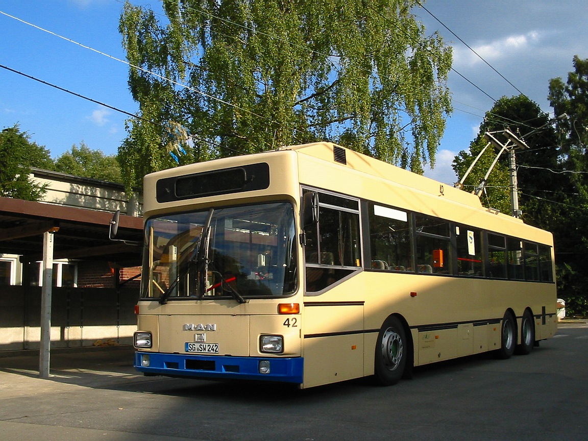 Obus 42 war ein Versuchsfahrzeug und Technologieträger von Vossloh/Kiepe. Er wurde am 29.12.1986 in Dienst gestellt und während den zahlreichen Tests immer wieder kurzzeitig Außerdienst gestellt. Mit diesem Experimentierfahrzeug wurde erstmalig der Drehstromantrieb in Obusfahrzeugen getestet. Die daraus gewonnen Erfahrungen konnten so später bei anderen Fahrzeugen, auch Strassenbahnen, verwendet werden. Der 42 läuft heute nicht mehr mit Drehstrommotor. Er gehört seit dem 15.11.2008 offiziell dem Obusmuseum Solingen und wurde in Eigenleistung wieder auf Gleichstromtechnik zurückgebaut. Dieser Obus wird, ähnlich wie Obus 5, als eiserne Reserve der Stadtwerke gesehen und kommt auf diese Weise hin und wieder zum Einsatz im Linienverkehr.