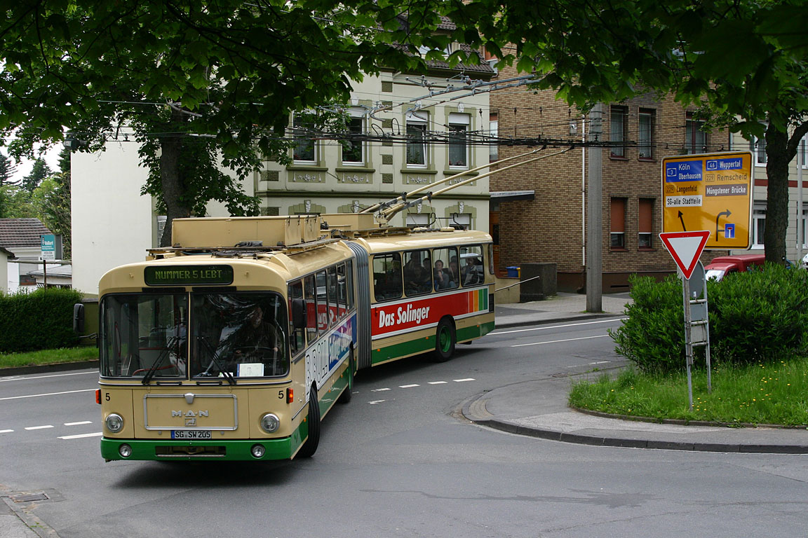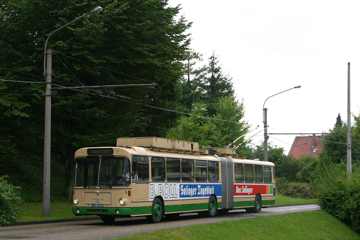 Als der ehemalige Wagen 5 der Stadtwerke Solingen am 07.05.2003 aus dem aktiven Dienst bei den Solinger Stadtwerken ausschied, einigte sich das Obusmuseum Solingen mit den SWS darauf das Fahrzeug, welches 1998 generalüberholt wurde, zum üblichen Marktwert zu erwerben und wieder in den Originalzustand zurück zu versetzen. So ging der Bus noch in 2003 in den Bestand des Museums über. Mittlerweile ist er aufgearbeitet und zurücklackiert worden und fährt, bei Fahrzeugengpässen der SWS, hin und wieder im Netz der SWS. |